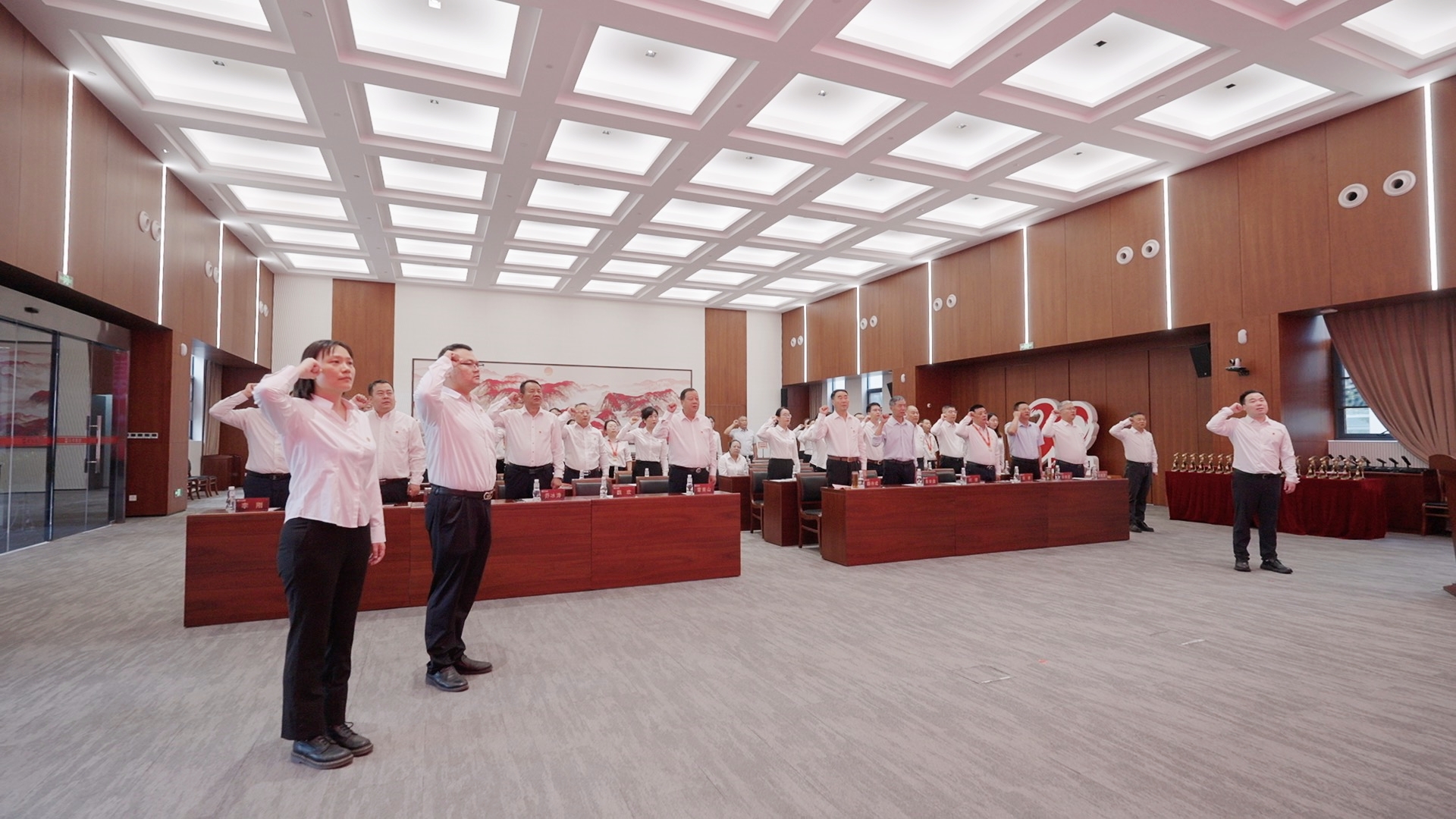 升旗儀式后,集團總裁魏歡帶領(lǐng)2名新黨員及36名黨員代表面向黨旗莊嚴宣誓。“我志愿加入中國共產(chǎn)黨,擁護黨的綱領(lǐng)……”,字字千鈞的誓言響徹全場,激蕩在每位黨員心間,激勵全體黨員在新時代新征程中奮勇爭先。