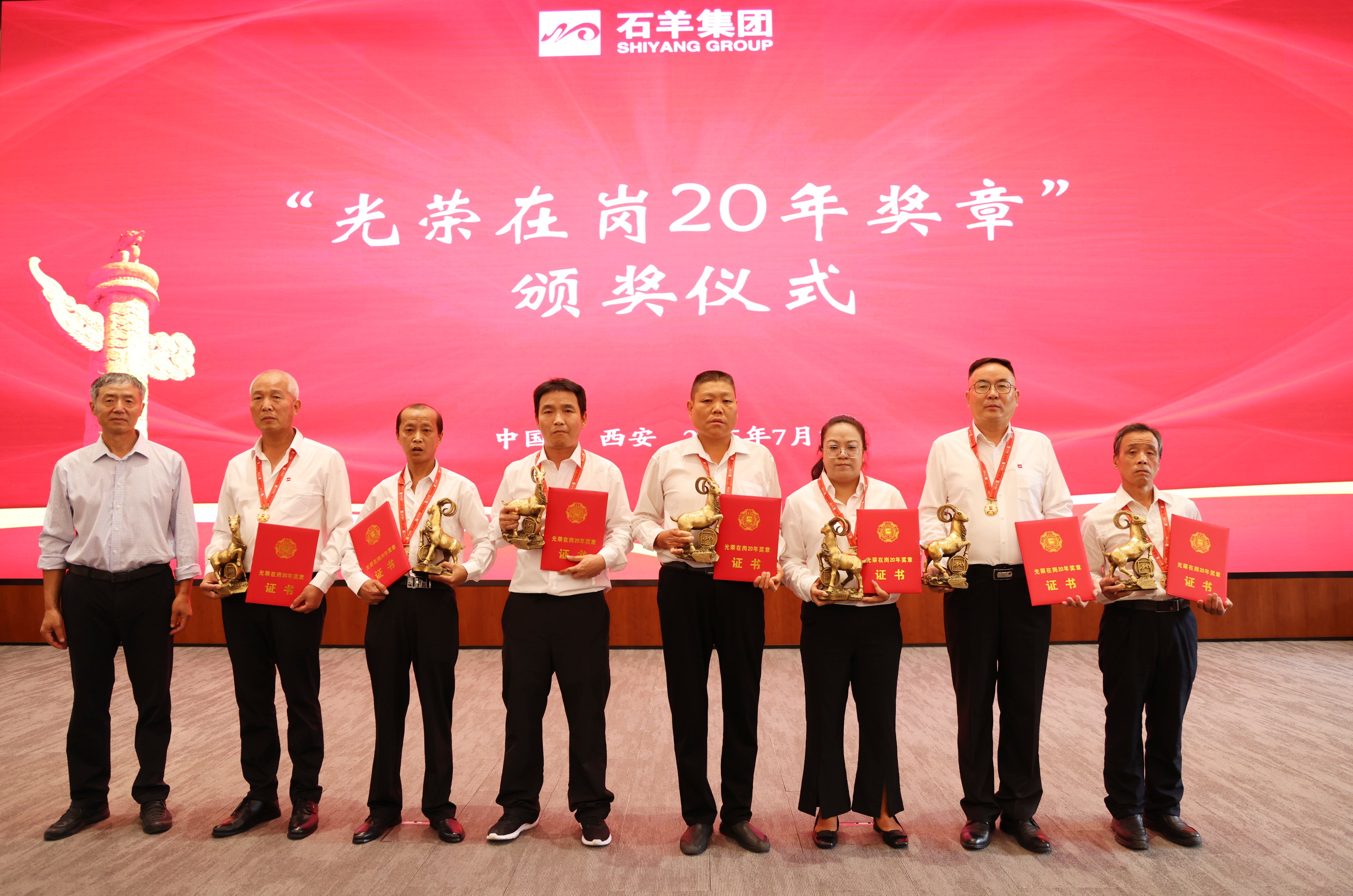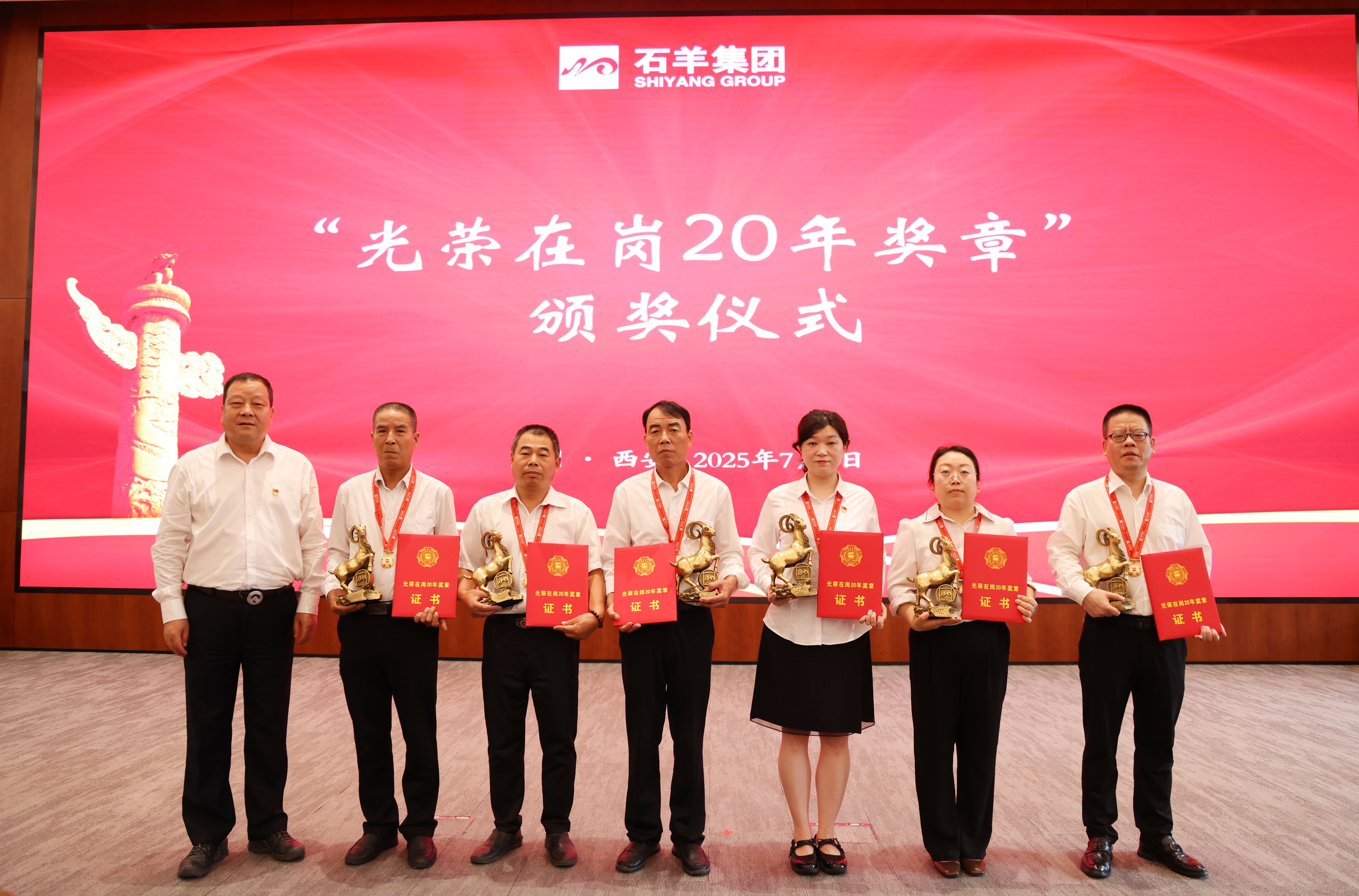 接下來,對在崗二十年員工進行表彰,頒發(fā)“光榮在崗20年獎章”。20年相伴相隨,石羊人將青春與熱血融入企業(yè)發(fā)展歷程,在各自崗位上默默耕耘、無私奉獻。當沉甸甸的獎章掛在胸前,閃耀的不僅是榮譽的光芒,更是他們20年如一日堅守與付出的見證,贏得了全場熱烈的掌聲與由衷的敬意。